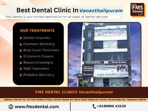 If you’re looking to enhance your smile, FMS Dental Hospital in Hyderabad, located near Vanasthalipuram, is a top choice for cosmetic dentistry. The clinic offers advanced cosmetic dental treatments, including smile designing, teeth whitening, Zoom teeth bleaching, and veneers/laminates, all performed by highly experienced cosmetic dentists.